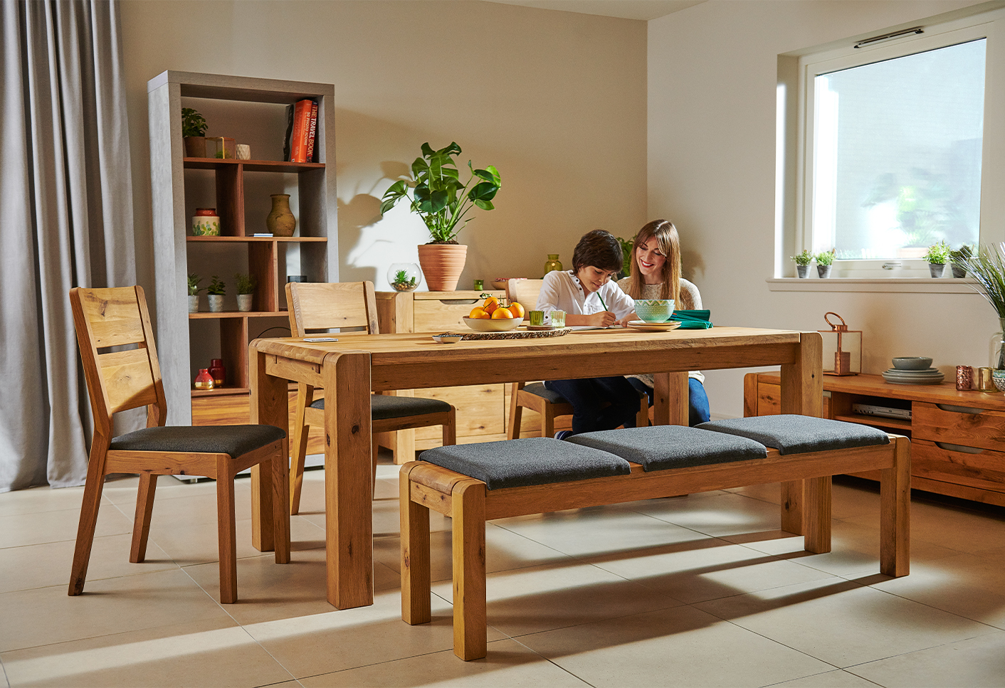 Casual, easy and low-key, Industrial dining spaces tend to take on the look of a cool hipster-style cafe by mixing functional bench seating and comfy cushions with solid wood furniture and fresh ingredients. We added subtle pops of colour to our Industrial bistro look with throws, retro lighting and tableware.
